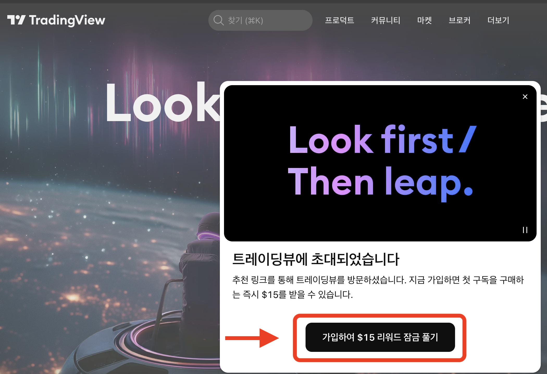 2. 아래와 같이 '트레이딩뷰에 초대되었습니다.' 문구가 떴을때 '가입하여 $15 리워드 잠금 풀기'를 누르셔야 성공적으로 리워드를 받으실 수 있습니다.