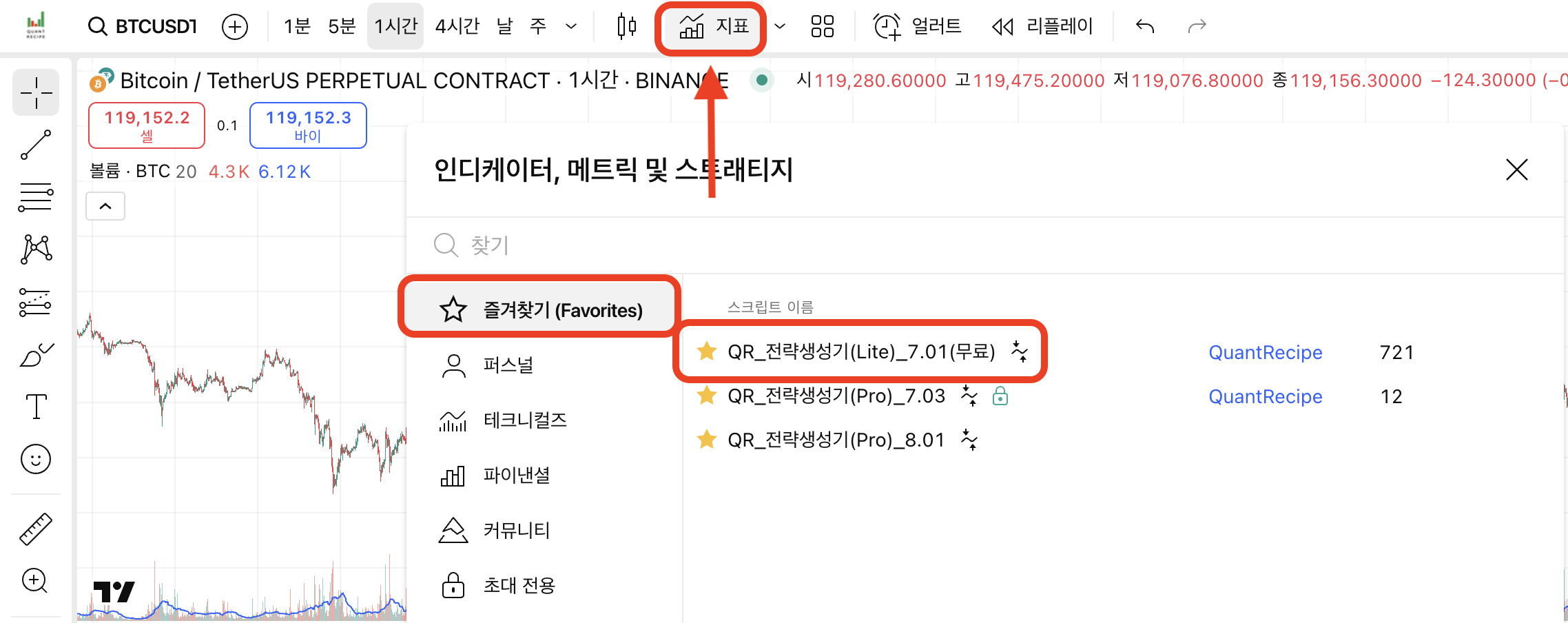 아래와 같이 지표 -> 즐겨찾기 -> 전략생성기(Lite) 순으로 클릭하면 됩니다.